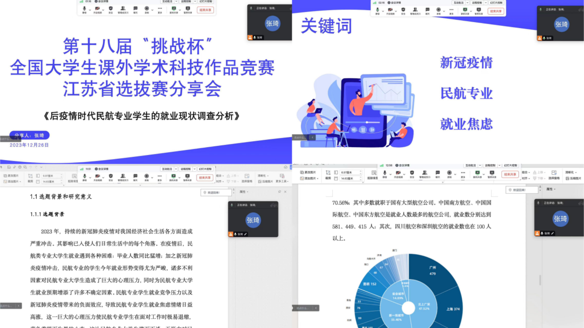 张琦等三位同学的作品《后疫情时代民航专业学生的就业现状调查分析》获得第十八届“挑战杯”全国大学生课外学术科技作品竞赛江苏省三等奖。张琦从参赛经验、成长感悟、个人收获等方面进行分享交流。
