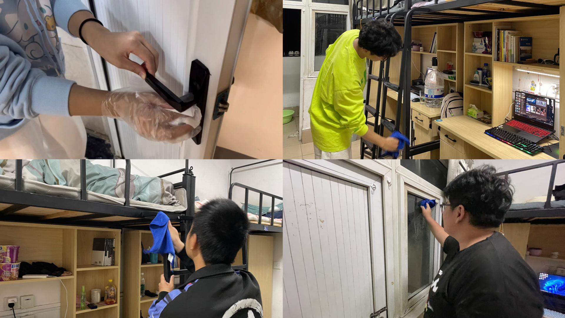 在打扫消杀期间,同学们积极响应系部的安排,动手打扫自己宿舍的卫生,将物品摆放整齐,分类归纳,仔细清扫地面灰尘碎片,分发次氯酸消毒液对地面及门把手等经常接触的公共区域进行擦拭消毒,及时清理杂物废物防止病菌滋生,同时开窗通风换气,确保宿舍环境整洁安全。大扫除过后,宿舍焕然一新,整洁干净,连带着宿舍的气氛也有了新的变化。