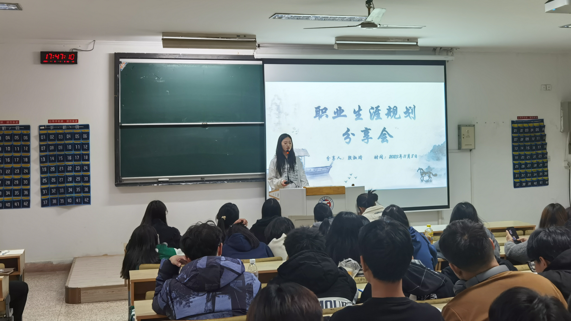 会上,殷淑琦同学从专业学习、目标选择、职业规划、能力提升、就业技巧等多角度多层次向同学们输出丰富知识。她建议同学们可以先进行自我分析,从职业性格、职业兴趣、职业能力、SWOT分析等方面了解自己,再进行短期、中期、长期的职业生涯规划,并做出相应的计划实施。
