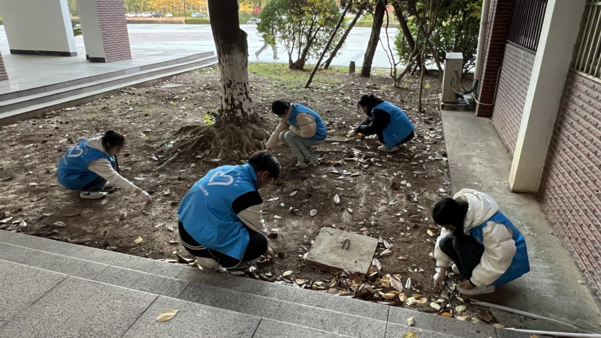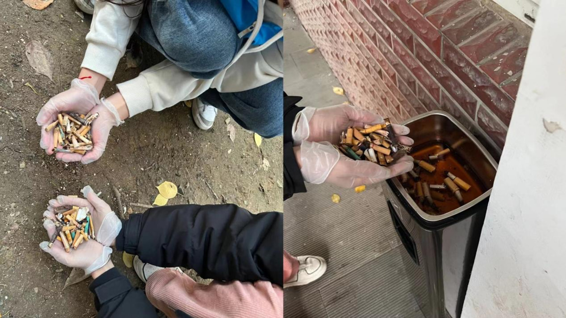 捡拾烟头,拾起文明,志愿者们身着黄色马甲,手拿垃圾袋和夹子,在校园各区域迅速行动,对学校主次干道、教学楼宇间、草丛、绿化带等地进行烟头捡拾。