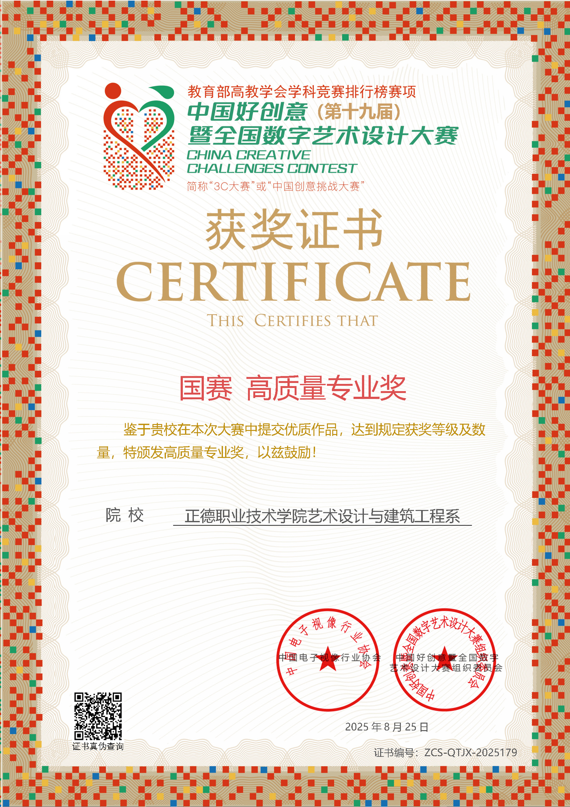 8月25日,第十九届中国好创意暨全国数字艺术设计大赛圆满落幕,成人韩漫 艺术设计与建筑工程系师生凭借卓越的创意实力与专业水平,荣获国家级一等奖3项、二等奖1项、三等奖3项,省级奖项5项,并首次摘得国赛“高质量专业奖”,获奖数量与层级均创历史新高,充分彰显了系部在数字艺术教育领域的深厚积淀与创新活力。