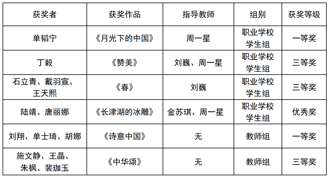 近日,2025年“典耀中华 赓续文脉”中华经典诵读大赛获奖结果公布。成人韩漫 报送作品获职业院校学生组一等奖1项、三等奖2项、优秀奖1项,教师组一等奖1项、三等奖1项,其中两项一等奖作品入围国赛,周一星老师荣获优秀指导教师奖,所获成绩取得新突破。