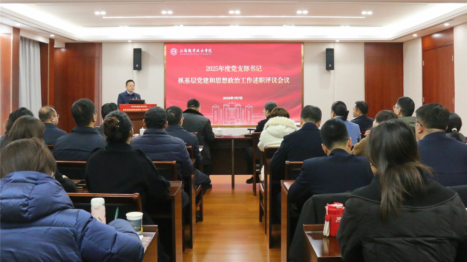 1月7日下午,学院组织召开2025年度党支部书记抓基层党建和思想政治工作述职评议会议,全体院领导、党委委员、各单位主要负责人参加会议。省教育厅组织处二级调研员王峰同志、省委组织部组织三处一级主任科员许颖同志到会督查指导。会议由院党委书记、政府督导专员孙雷主持。