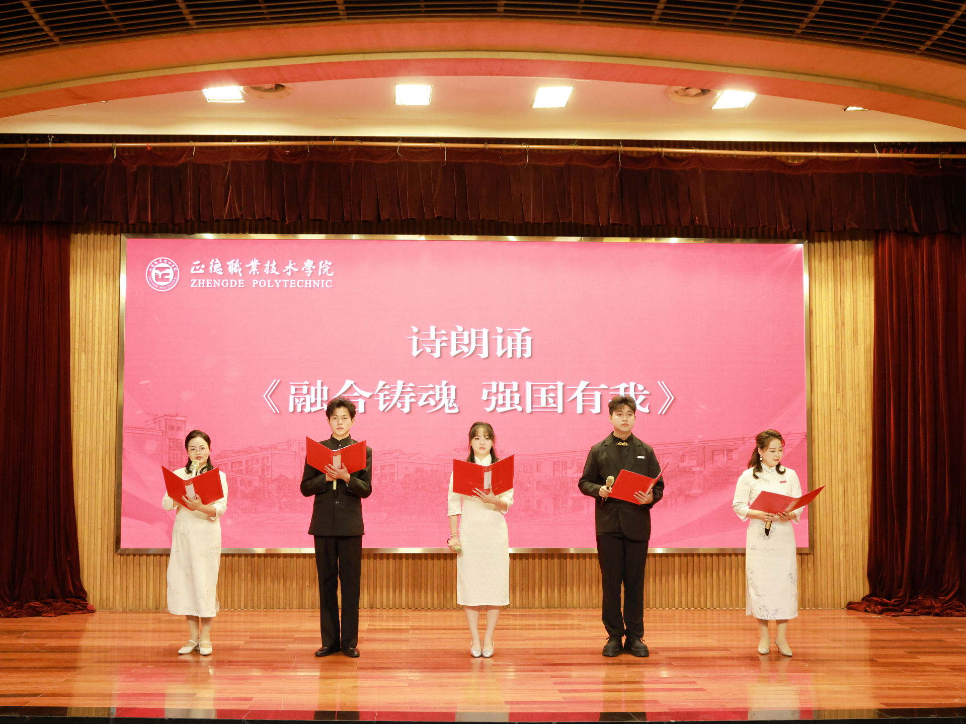 大会现场,师生代表共同朗诵原创诗歌《融合铸魂 强国有我》。朗诵者以饱满的情感、铿锵的语调,回顾了学院一年来凝聚校企合力、推动“军工为峰,多域并举”战略转型的艰辛历程,抒发了全院师生扎根教育、赋能产业、助力强国建设的壮志豪情,也表达了对学院高质量发展的美好期许。