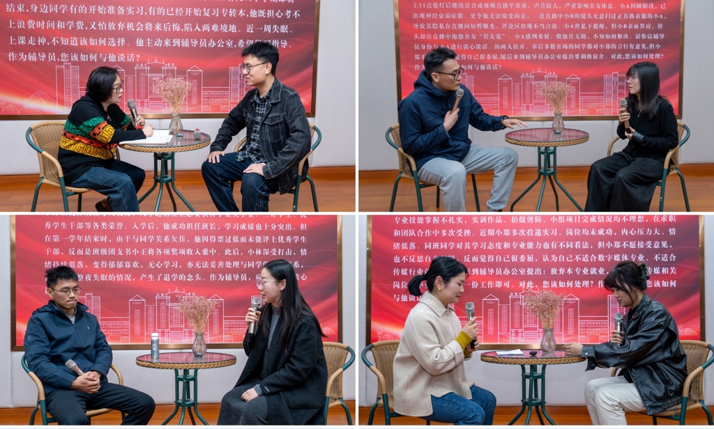 在谈心谈话情景模拟及分析研讨环节,四所院校分别围绕人际关系、心理健康、就业指导和学业规划类型的高频工作场景,真实还原日常谈心谈话过程。现场辅导员作为谈话者,紧扣谈话题目,运用倾听共情、循循善诱、精准引导的谈话技巧,与“学生”展开面对面沟通,耐心倾听诉求、细致分析问题、积极寻找解决方案。分析研讨时,大家及时点评、相互指正,针对谈话中存在的不足提出改进建议,在实战演练中锤炼谈话本领、提升沟通能力,真正实现了“在模拟中学习,在交流中提升”,为其他辅导员提供了可借鉴、可复制的实践经验。