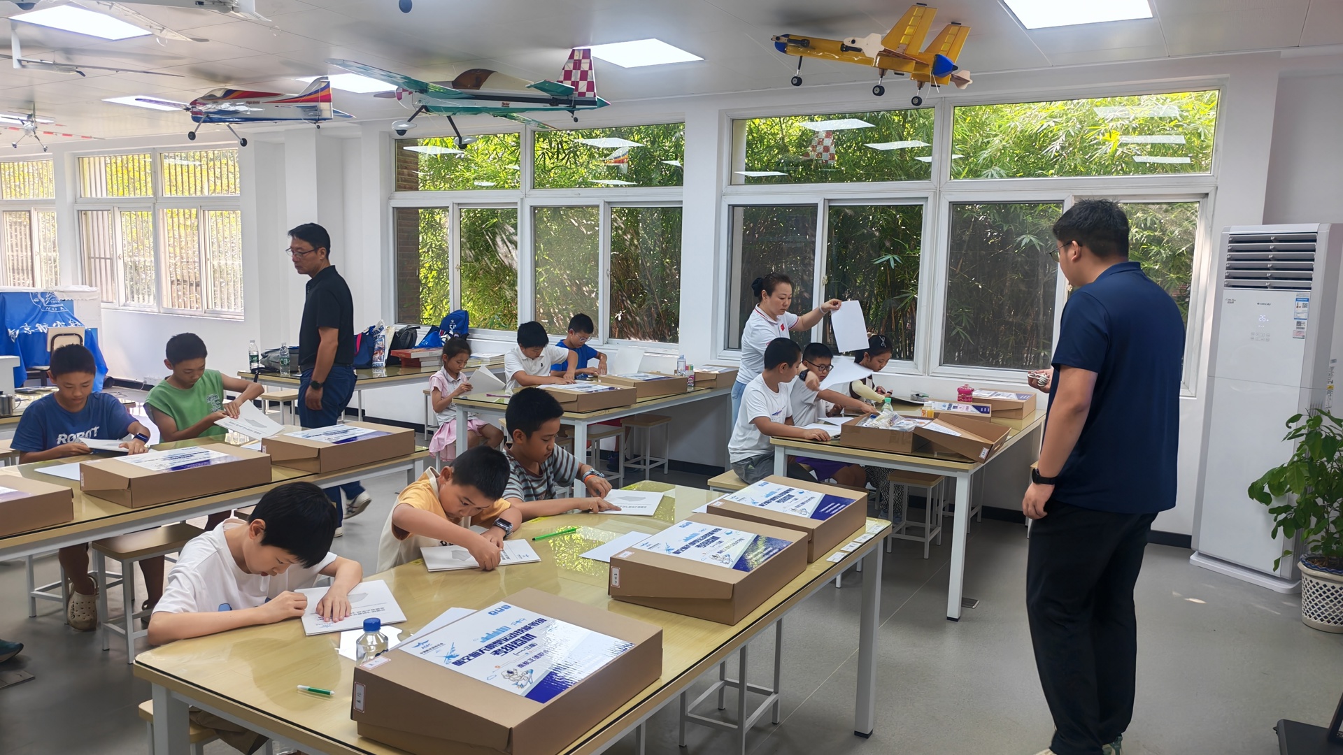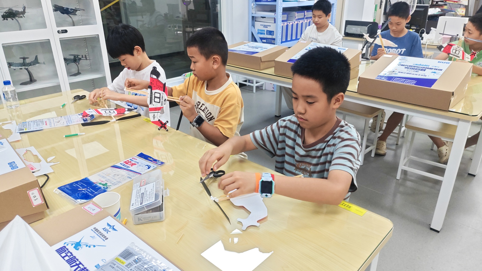 现场制作区域氛围紧张而有序,考生们专注地裁剪、折叠、拼接,手指翻飞间,一张张卡纸、一个个模型部件逐渐变成形态各异的航模雏形。有的考生为确保纸飞机折边整齐,反复调整折叠角度;有的考生在组装仿真模型火箭时,仔细核对箭体与尾锥的衔接位置,力求达到最佳制作效果。监考老师则在各区域巡回,实时检查模型制作是否符合规范,及时解答考生关于制作细节的疑问。