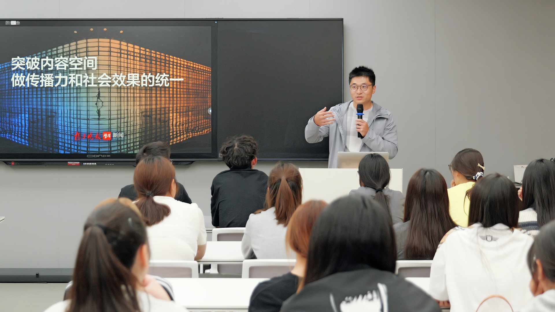 本次介绍会特邀行业导师扬子晚报紫牛成人韩漫主任刘浏,以“AI时代融媒人不可替代的价值”为主题,与新生们畅谈。刘浏结合当前传媒行业对技术型人才的迫切需求,指出在人工智能快速发展的背景下,具备内容策划、技术融合与价值判断能力的融媒体人才依然具有核心优势。他鼓励同学们找准个人热爱的方向,夯实专业基础,在未来学习中注重培养有思想、有温度、有深度的创作能力。此外,刘浏还分享了其18年媒体一线的实战案例,建议同学们利用假期积极参与媒体实习,拓宽视野、积累经验,为未来就业增加竞争力。