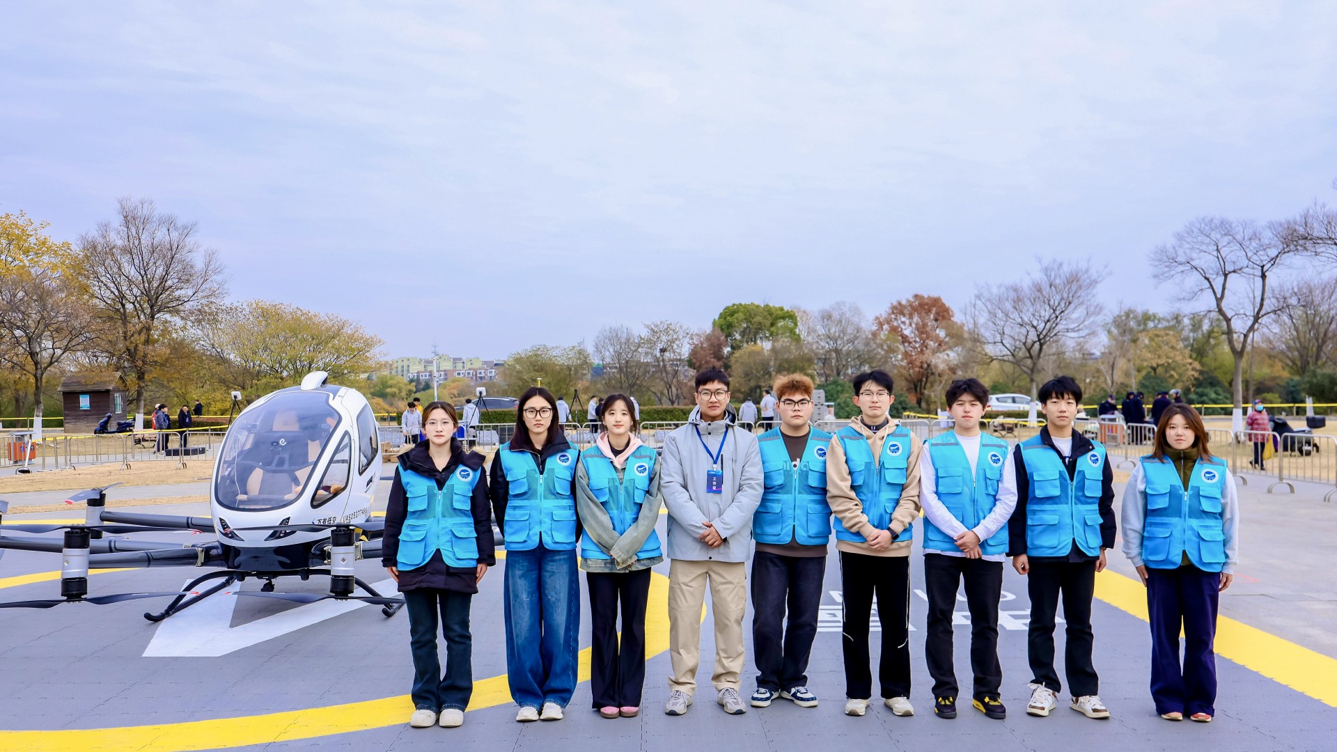 2025年12月4日下午,南京市“‘钟山首飞·万有启航’应用场景观摩会暨紫金山eVTOL首次载人飞行仪式”在钟山体育运动公园隆重举行。民用航空系受邀参与此次活动。