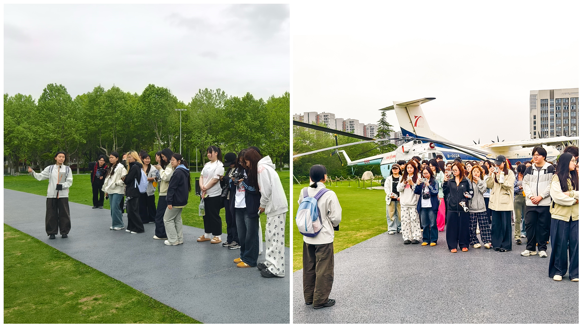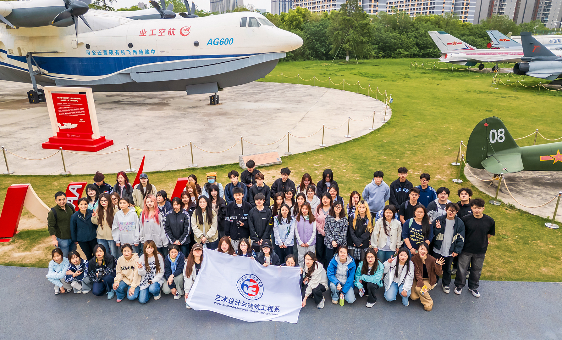 实践活动第一站师生们来到了南航御风园,在讲解员的带领下,大家不仅看到了新中国制造的第一架飞机初教5、国产大飞机三剑客之一的“鲲龙”AG600、强-5强击机等一系列功勋机型,还了解了每架飞行器背后的红色故事:从初教5历经90多天攻坚克难实现新中国飞机制造“零的突破”,到“鲲龙”AG600历经15载攻克110项关键技术、填补我国特种大飞机领域空白,再到南航科研工作者薪火相传、为国铸重器的坚守,同学们在这里深刻感悟到“航空报国、勇攀高峰”的精神内核。