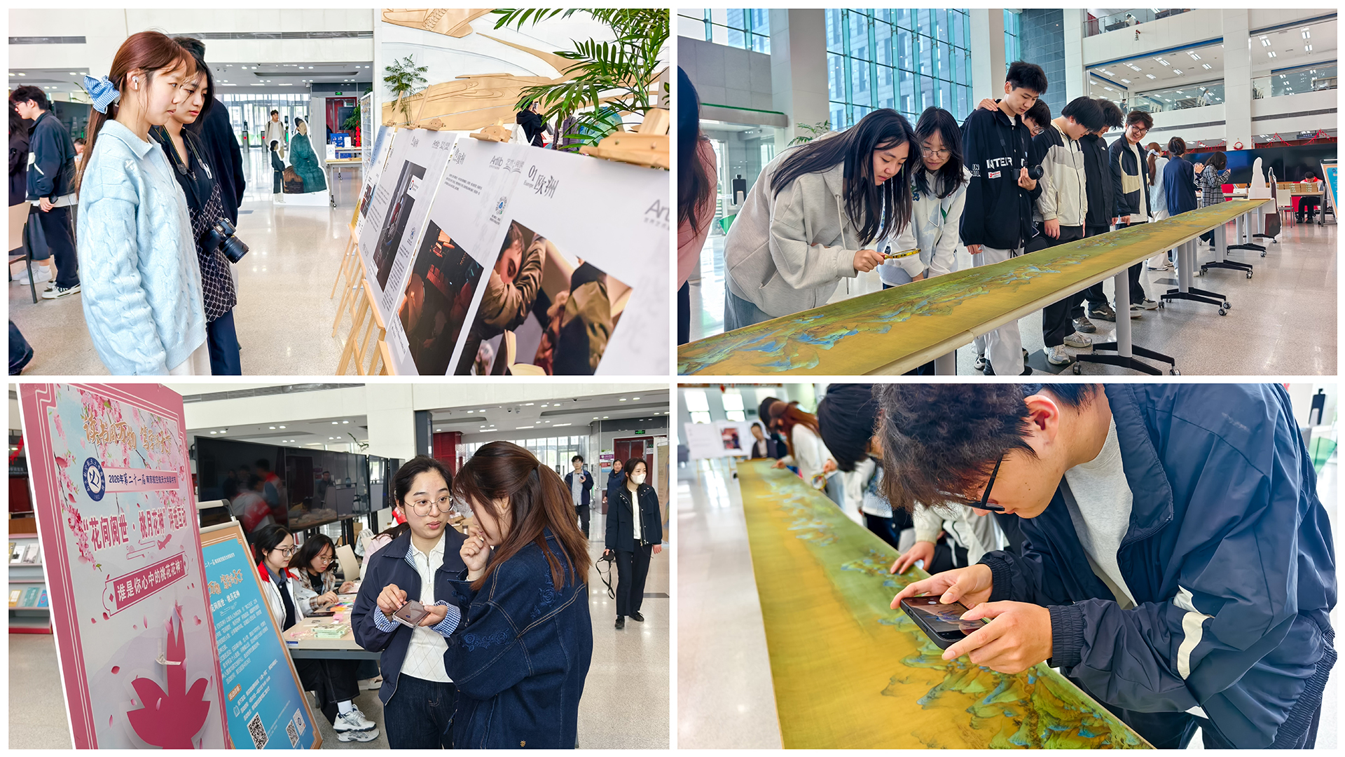 随后,师生一行转至南航图书馆,参观了正在展出的“江山入画”山水艺术微展与“‘阅行无界’镜头下的诗和远方”摄影展,据南航图书馆老师介绍,“江山入画”微展精选《千里江山图》《游春图》等国宝级山水名作高清复制品,高度还原古画神韵;“‘阅行无界’镜头下的诗和远方”摄影展以世界各地的阅读风貌为主题,展现出阅读作为跨越时空精神纽带的独特价值。现场还设置了异形打卡装置,为参观者打造沉浸式观展体验。