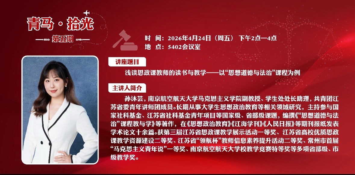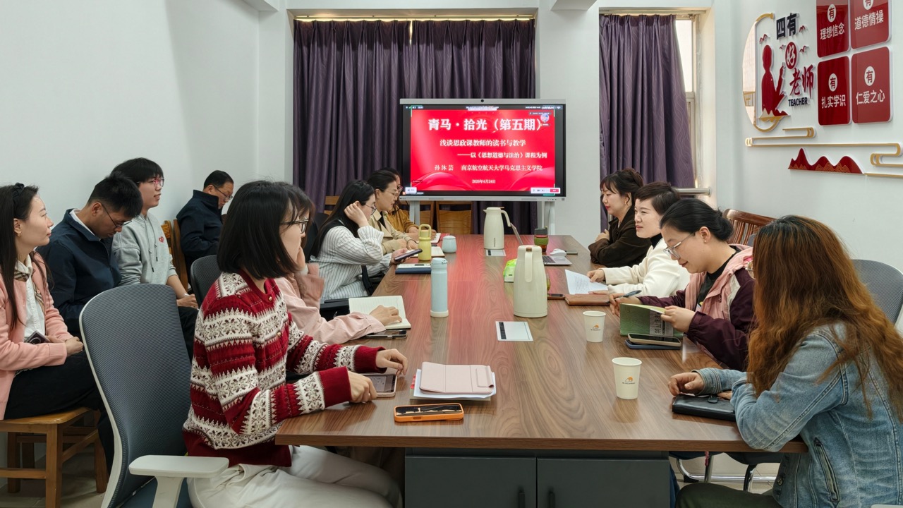 “春读书,兴味长,磨其砚,笔花香。”值此全国首个全民阅读周之际,4月24日思政教研部举办了“青马·拾光”第五期读书沙龙活动。本次活动特邀南京航空航天大学马克思主义学院孙沐芸副教授,以“浅谈思政课教师的读书与教学——以《思想道德与法治》课程为例”为题作专题分享。院党委书记、政府督导专员孙雷及在宁四校联盟单位的思政课教师代表,采用“线上+线下”联动模式参加了活动,思政教研部主任李颖主持本期沙龙。